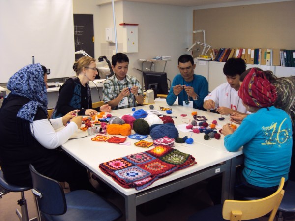 Moni- ja interkulttuurinen käsityö -kurssin työpajassa opiskelijat virkkasivat isoäidinneliöitä hyväntekeväisyyskampanjaan.