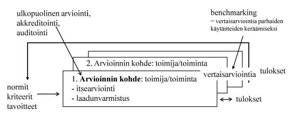 Yliopiston toimintaympäristössä käytetyimpiä arviointitapoja ovat itsearviointi, auditointi, benchmarking sekä laadunvalvonta, -hallinta ja -varmistus (ks. esim. Moitus & Saari, 2004; Ursin, 2007). Korkeakoulutuksen yhteydessä arviointi sekoitetaan usein laadunvarmistukseen ja laatuprosesseihin, sillä toiminnan tasolla ne ovat lähellä toisiaan ja tavoittelevat usein samaa: toiminnan kehittämistä. Laadun varmistamisella (quality assurance) tarkoitetaan yleensä toimintoja, prosesseja ja järjestelmiä, joilla pyritään turvaamaan toiminnan korkea laatu sekä kehittämään sitä jatkossakin (Korkeakoulutuksen laadunvarmistus, 2004, 50). Hämäläisen (1998, 34) mukaan koulutuksen laadunvarmistamisessa on kyse siitä, miten koulutusohjelmassa kerätään tietoa tavoitteiden saavuttamisesta ja miten tiedon käyttö varmistetaan. Henry ym. (2001, 74) ovat tosin problematisoineet OECD:n koulutuspolitiikassa erityisesti laadunvarmistuksen (quality assurance) ja laadun kehittämisen (quality improvement) välisiä jännitteitä.