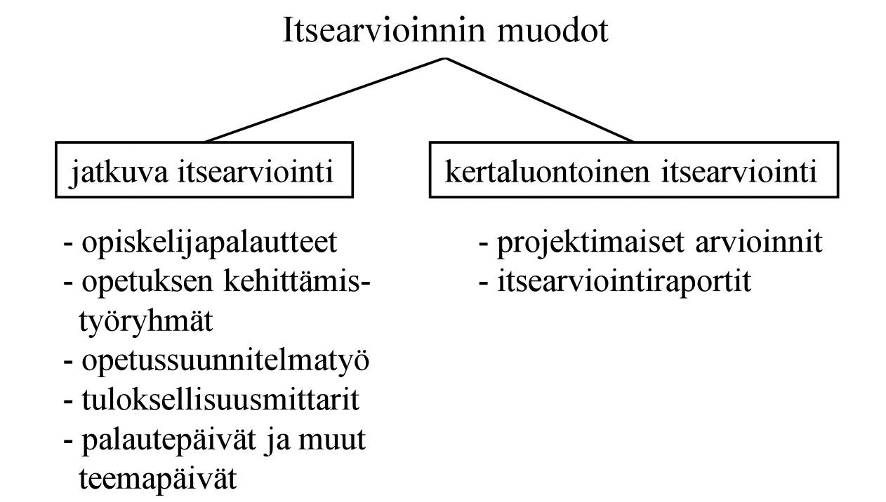 Itsearviointi ei ole irrallinen ilmiö yliopiston tai laitoksen muusta toiminnasta, vaan siihen liittyvät monet yliopiston ja laitoksen opetuksen arviointi- ja kehittämistoimet. Vastaajat laajensivat itsearvioinnin koskemaan lähes kaikkea laitoksen kehittämistyötä. Voidaankin miettiä, miksi laitosten toimijat käsittivät itsearvioinnin näin laajaksi. Luetaanko itsearvioinniksi kaikki laitoksen kehittämistoiminta silloin, jos laitoksella ei ole toteutettu projektimaisia, kertaluontoisia itsearviointeja? Toisaalta jatkuvan itsearvioinnin muodot ovat lähempänä itsearvioinnin ideaalia, jossa keskeistä on kriittinen analyysi omasta toiminnasta sekä itsen ja oman toiminnan kehittäminen.