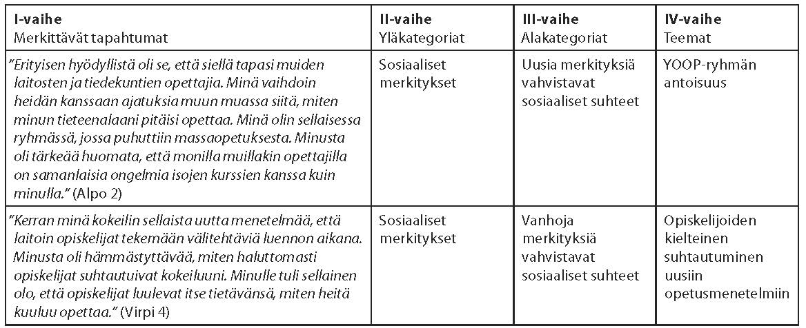 Narratiivien temaattinen analyysi alkoi YOOP-tarinoiden lukemisella ja yksittäisten merkittävien tapahtumien erottamisella analyysiyksiköiksi. Merkittävät tapahtumat luokiteltiin transformatiivisen oppimisen ulottuvuuksien avulla yläkategorioihin etsimällä tapahtumakuvauksista sosiaalisia, emotionaalisia, kognitiivisia, kontekstuaalisia ja toiminnallisia merkityksiä. Tämän jälkeen kunkin kategorian sisältämiä otteita tarkasteltiin suhteessa toisiinsa. Yläkategorioiden sisältämät analyysiyksiköt jaettiin alakategorioihin, jotka nimettiin joko uusia tai vanhoja merkityksiä vahvistaviksi. Koska kaikkien kognitiivisten tapahtumien tulkittiin edistävän uusien merkitysten oppimista, jaettiin kognitiivisesti merkittävät tapahtumat poikkeuksellisesti arvioivaan ja kriittiseen reflektioon. Ylä- ja alakategorioiden sisältämät analyysiyksiköt ryhmiteltiin teemoiksi, jotka nimettiin kuvaamaan tapahtumien sisältöä. Tutkimuskysymykset ja valittu teoreettinen viitekehys ohjasivat teemojen erittelyä. (Ks. Marjala, 2009, 74–75.) Elämänviivapiirrokset, haastattelumuistiinpanot ja haastatteluiden jälkeen kirjatut huomiot toimivat kontekstina analyysille. Taulukossa 1 esitetään temaattisen analyysin vaiheet aineistoesimerkkien avulla.
