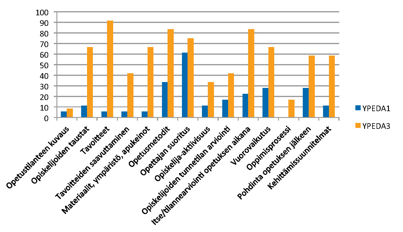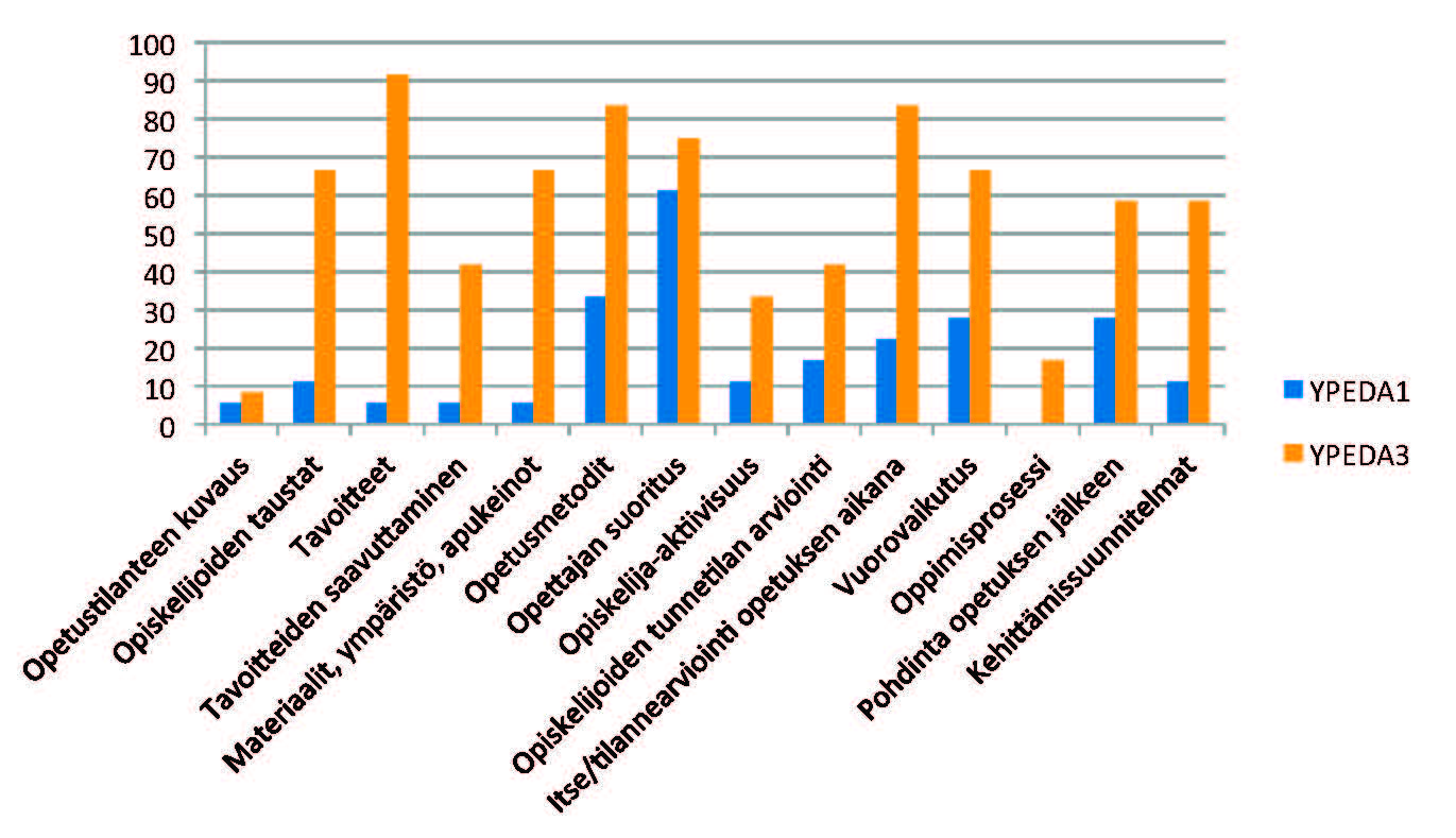 YPEDA3-kurssilaiset olivat kuvanneet opetustilanteen pedagogisia elementtejä huomattavasti monipuolisemmin kuin YPEDA1-kurssilaiset (kuvio 1). Prosentuaalinen osuus niistä teksteistä, joissa pedagoginen elementti oli jollakin tavoin perusteltu, oli YPEDA3-ryhmässä tilastollisesti merkitsevästi (P < 0,0001) korkeampi kuin YPEDA1-ryhmässä.