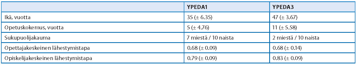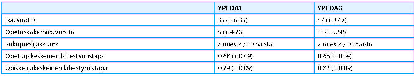 Taustatietokartoituksessa kävi ilmi, että YPEDA1-kurssilaiset olivat keski-iältään yli kymmenen vuotta nuorempia kuin YPEDA3-kurssilaiset (taulukko 1). Heillä oli keskimäärin myös runsaat viisi vuotta vähemmän opetuskokemusta. Molemmissa ryhmissä oli vähemmän miehiä kuin naisia, mutta YPEDA3-ryhmässä ero oli suurempi. ATI-kyselyn perusteella opetuksen opettaja- ja opiskelijakeskeisyydessä ei ollut havaittavaa eroa. Molempien ryhmien opetuksessa painottui opiskelijakeskeisyys, mutta profiilit sisälsivät huomattavan paljon osia molemmista opetuskäsityksistä. Alle 0.1 yksikön ero opetuskäsityspisteissä oli 41 %:lla YPEDA1- ja 42 %:lla YPEDA3-kurssilaisista.