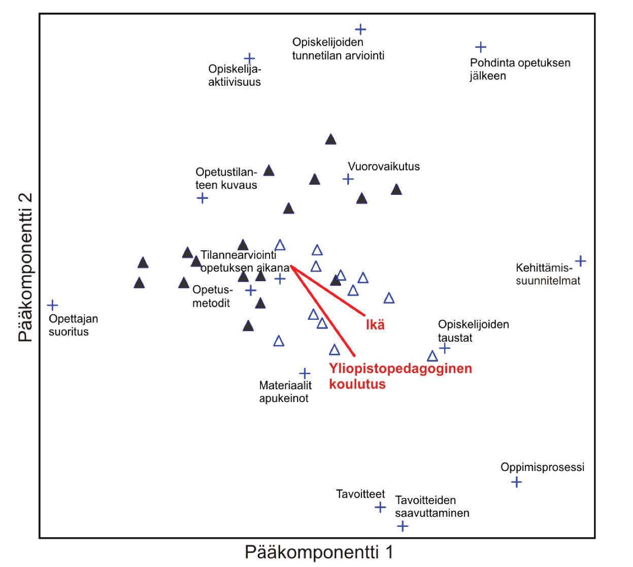 Kuvio 3. Opettajien taustojen (origosta lähtevät punaiset suorat, iso teksti) vaikutus pedagogisten elementtien (plus-merkit, pieni teksti) kuvaukseen. YPEDA1-kurssilaiset on merkitty mustilla kolmioilla ja YPEDA3-kurssilaiset valkoisilla kolmioilla. Kuvassa näkyvät vain ne taustatekijät (yliopistopedagoginen koulutus ja ikä), joilla oli tilastollisesti merkitsevä vaikutus pedagogisten elementtien kuvaukseen.