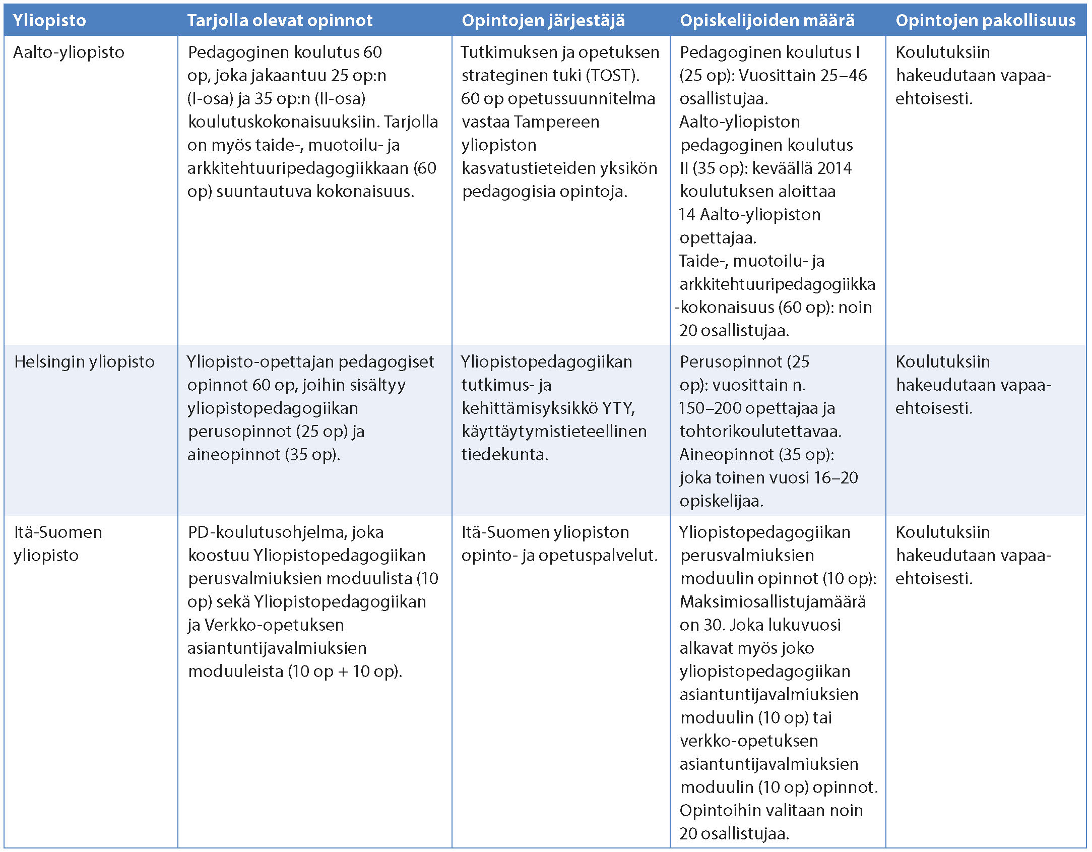 Peda-forum-verkoston 20-vuotisjuhlavuoden kunniaksi päätimme lehdessä kartoittaa yliopistopedagogisten koulutusten tilannetta yliopistoissamme. Pyysimme kaikkia Suomen yliopistoja lähettämään kuvauksen omasta tämänhetkisestä yliopistopedagogisesta koulutuksestaan. Toiveissamme oli myös lyhyt historiikki yliopistopedagogisen tilanteen kehityksestä yliopistoissa. Nämä kuvaukset voi lukea lehden tästä numerosta. Lukijaa helpottaaksemme laadimme taulukon koulutusten muutamista peruselementeistä. Taulukossa 1 esitetään yliopistoissa tarjolla olevat opinnot, opintojen järjestäjät, opiskelijoiden määrät sekä se, ovatko opinnot pakollisia vai eivät.
