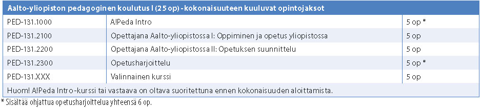 Taulukko 1. Aalto-yliopiston pedagogisen koulutuksen I (25 op) opintojaksot