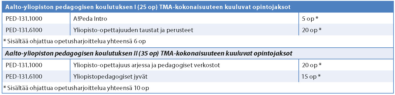 Taulukko 3. Aalto-yliopiston taide-, muotoilu- ja arkkitehtuuripedagogiikan (TMA) pedagogisen koulutuksen I ja II (25 op + 35 op) opintojaksot