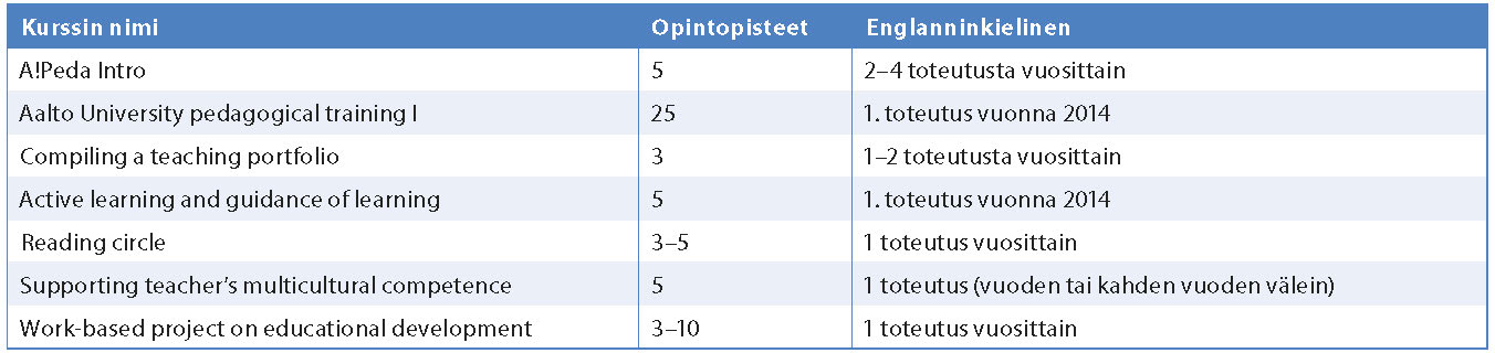 Yliopistopedagoginen koulutus (60 op) on tarkoitettu Aalto-yliopiston opetushenkilökunnalle. Taide-, muotoilu- ja arkkitehtuuripedagogiikan kokonaisuus (60 op) on suunnattu niille Aalto-yliopiston opettajille, jotka toimivat taide-, muotoilu- tai arkkitehtuurialan opettajina. Kokonaisuuksien I ja II (25 op ja 35 op) lisäksi tarjontaan kuuluvat myös valinnaiset kurssit, joille voi osallistua, vaikka ei olisikaan mukana kokonaisuudessa. Osallistujavalinnoissa huomioidaan ensisijaisesti professori- ja lehtoriurapoluille nimitetyt henkilöt.