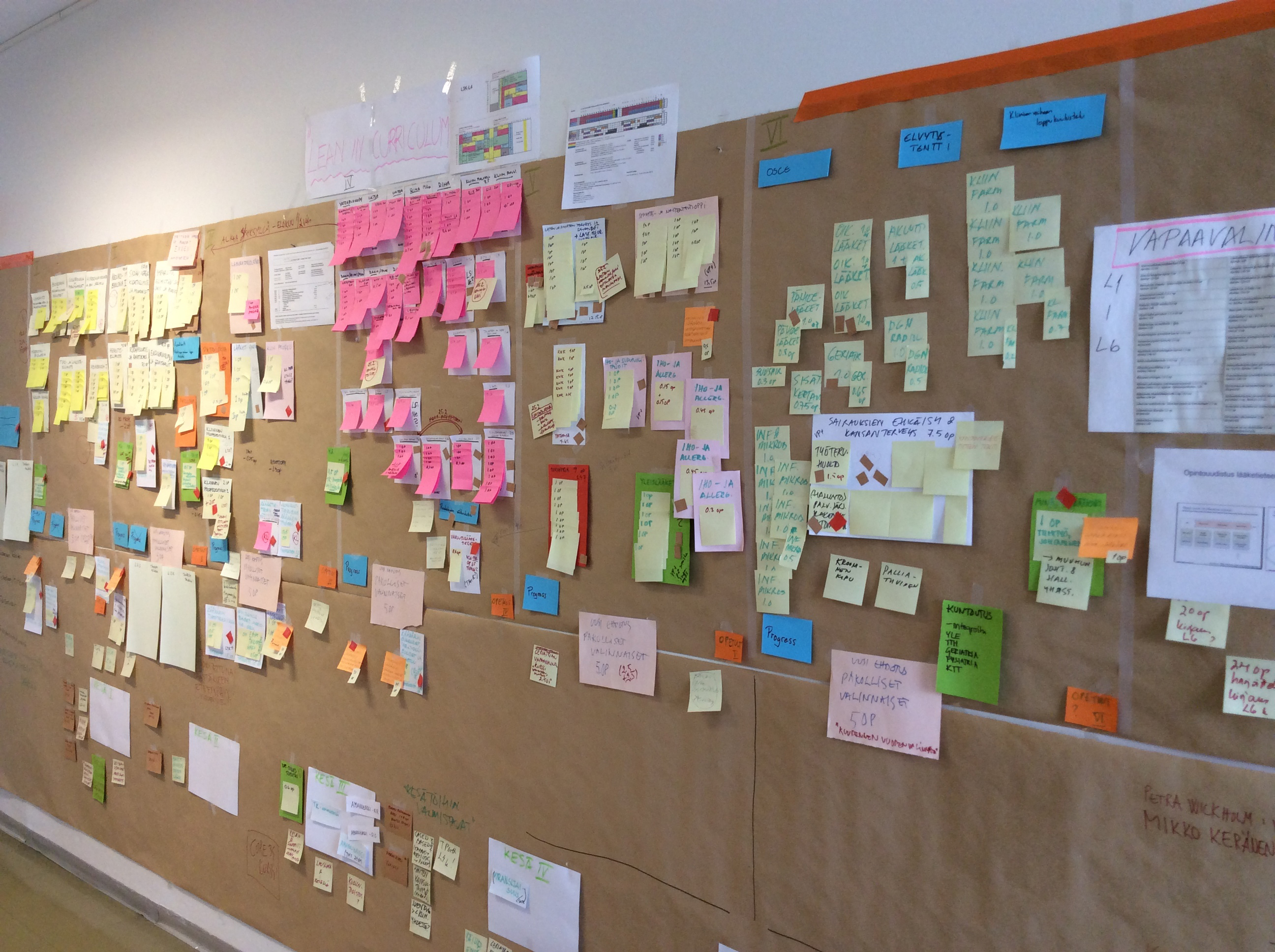 Kuva 1. Lääketieteen opetuksen visualisointiseinä, johon on päivitetty kaikki opetuksen sisältöön kuuluva informaatio. Kaikki voivat nähdä yhdellä silmäyksellä, mitä lääketieteen opetus pitää sisällään. Visuaalinen suunnittelu on yksi opetuksen sisällön uudistuksen työkaluista. Kuva: Anne Pitkäranta
