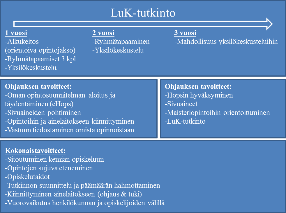 Ryhmätapaamisissa aloitetaan henkilökohtaisen opintosuunnitelman teko muiden yhteisesti keskusteltavien ja käsiteltävien aiheiden lisäksi. Tapaamisten aiheet tulevat pääsääntöisesti opiskelijoilta, ja näitä ovat olleet mm. kesätyöt, kemistien työllistyminen ja työnhaku. Lisäksi kukin hops-ohjaaja voi sovittujen kurssilinjauksien sisällä muokata omaa ohjaamistyötään kulloisenkin opiskelijaryhmän tarpeita vastaaviksi. Hops-ohjaajina toimivat laitoksella työskentelevät yliopistonopettajat, joiden pedagogiseen pätevöittämiseen ja osaamisen kasvun tukemiseen on kiinnitetty erityistä huomiota. Kuviosta 1 voidaan nähdä tällä hetkellä toteutettavan hops-ohjauksen linjaukset ja jakaantuminen koko LuK-tutkinnon ajaksi.