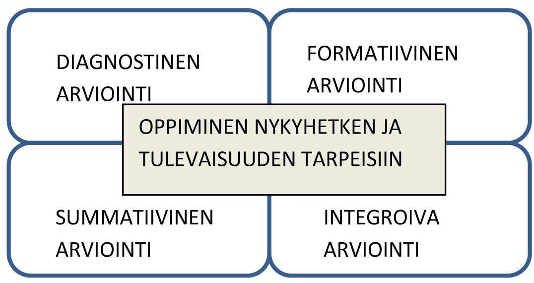 Kaikki koulutuksen aikaiset arviointitapahtumat voitaisiin Crispin (2012) mukaan jakaa niiden tavoitteen mukaisesti neljään eri tyyppiin (kuvio 1). Termit diagnostinen, formatiivinen ja summatiivinen voitaisiin varata kuvaamaan totuttuja näkökulmia, joissa arvioinnin tavoitteena on vaikuttaa opiskelijoiden senhetkiseen oppimiseen. Termiä integroiva voisi käyttää spesifisesti kuvaamaan niitä arviointitapahtumia, joiden ensisijainen tavoite on vaikuttaa opiskelijoihin tulevaisuuden oppijoina. Ensimmäisen tavoitteen toteutuminen vaikuttaa käytännössä lähinnä siihen, miten opiskelijat selviytyvät ja kehittyvät summatiivisten arviointien suorituksissa, kun taas jälkimmäiseen kytkeytyvät opiskelijoiden kehittyminen oman oppimisensa säätelyssä sekä elinikäinen oppiminen.