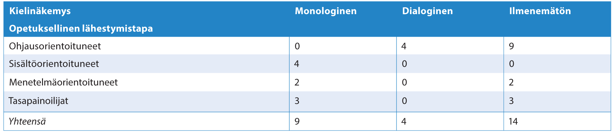 Sinänsä on kiinnostava tulos, että pedagogista kehittämistä ja opetusfilosofiaa on mahdollista kuvata ilman, että kielinäkemys välttämättä nousee esiin. Tällaisessa tekstissä opettaja on yleensä keskittynyt kuvaamaan esimerkiksi opiskelijoiden toiminnan ohjaamista, ilmapiirin rakentamista, opiskelijoiden sitouttamista ja motivointia ja tavoitteiden asettelun tai yhteistoiminnallisuuden tukemista. Hän ei tarkastele oppimisen kohteita tai muutoin ilmennä sitä, mitä hän katsoo opettavansa kun hän opettaa kieltä. Opetuksellisilta lähestymistavoiltaan kaikkia aineistoni opettajia voi pitää tietyllä tapaa oppimislähtöisinä. Lähestymistavoissa opetukseen on silti havaittavissa eroja, ja tekstien perusteella opettajat on jaettavissa neljään ryhmään – ohjausorientoituneisiin, sisältöorientoituneisiin, menetelmäorientoituneisiin ja tasapainoilijoihin. Kuten taulukosta 1 ilmenee, monologisen kieli-ideologian pohjalta toimivia opettajia on sekä sisältöorientoituneiden, menetelmäorientoituneiden että tasapainoilijoiden ryhmässä. Dialoginen näkemys kielestä näyttää sen sijaan olevan ominainen vain ohjausorientoituneille. On tosin huomattava, että ohjausorientoituneiden ryhmän 13 opettajasta peräti yhdeksän kielinäkemyksestä ei voi tehdä päätelmiä heidän opetussuunnitelma- tai opetusfilosofiatekstiensä perusteella, joten olen luokitellut heidät ilmenemättömän kielinäkemyksen ryhmään.