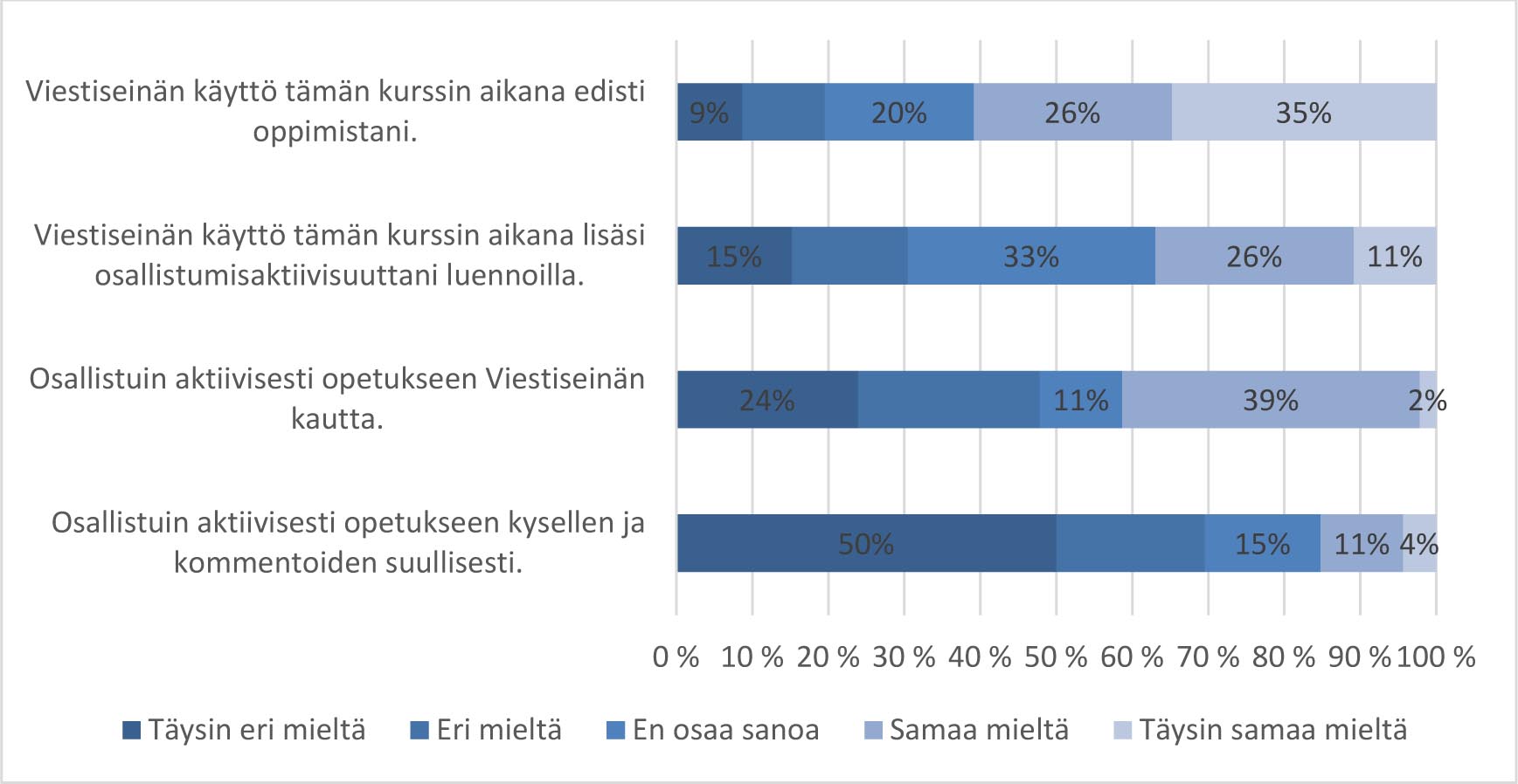 Opiskelijoiden vastaukset (n = 46) Viestiseinän käyttöä koskeviin väittämiin on esitetty kuviossa 1. Jopa 35 prosenttia kyselyyn vastanneista opiskelijoista koki, että sovelluksen käyttö edisti heidän oppimistaan. Opiskelijoiden vastausten perusteella luennoitsijan tapa hyödyntää sovellusta vaikutti suuresti opiskelijoiden kokemukseen sen hyödyllisyydestä.