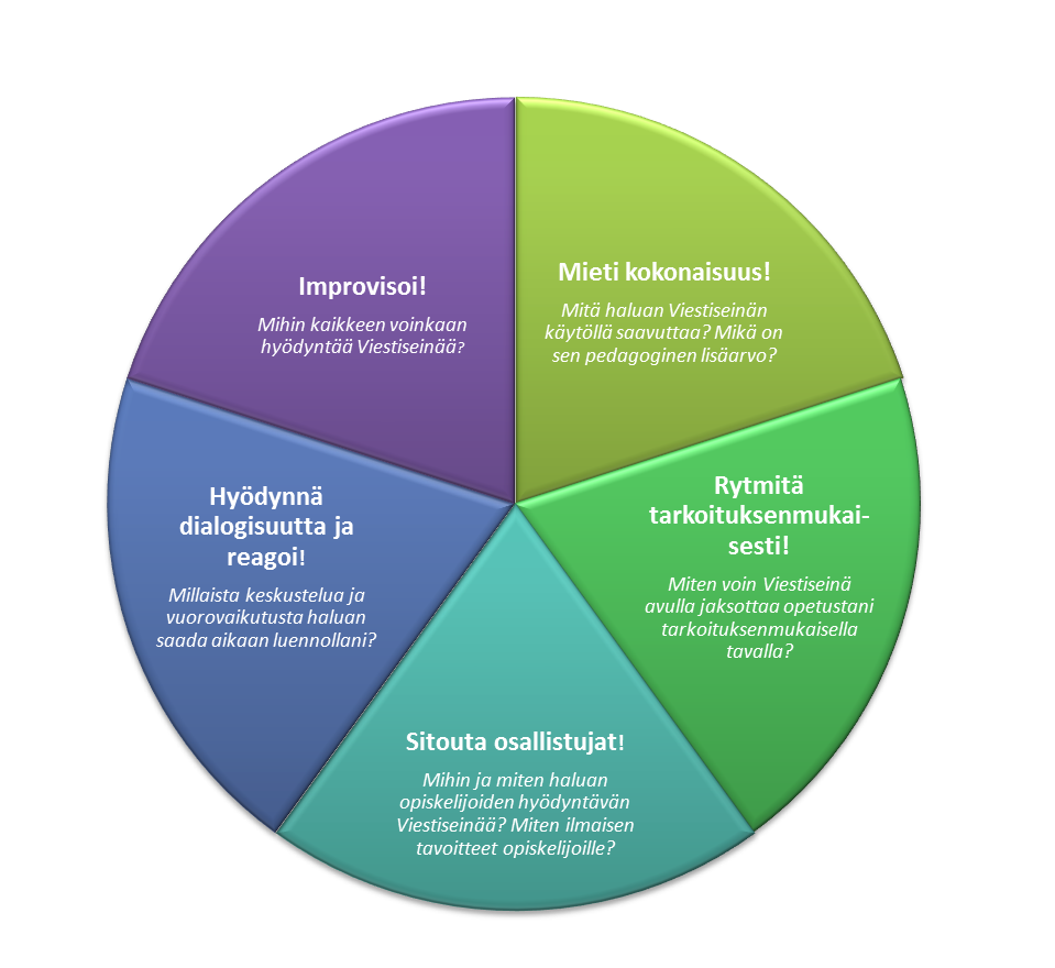 Luentosalit ovat perinteistä frontaaliopetusta tukevia tiloja, joiden monimuotoinen hyödyntäminen modernin oppimiskäsityksen mukaiseen aktiiviseen ja vuorovaikutteiseen oppimiseen ei ole helppoa. Vuorovaikutteisuutta tukevat teknologiset välineet ja sovellukset voivat kuitenkin muuttaa yksisuuntainen luennon moninapaiseksi vuorovaikutuksen verkostoksi ja toimia resurssina opiskelijoiden osallistumismahdollisuuksien lisäämiseksi. Koska tämän opetuskokeilun perusteella luennoitsijan tapa hyödyntää Viestiseinää vaikuttaa suuresti opiskelijoiden kokemukseen, kehitimme mallin Viestiseinä-sovelluksen käytöstä oppimisen edistämiseksi ja osallistujien aktivoimiseksi (kuvio 2).