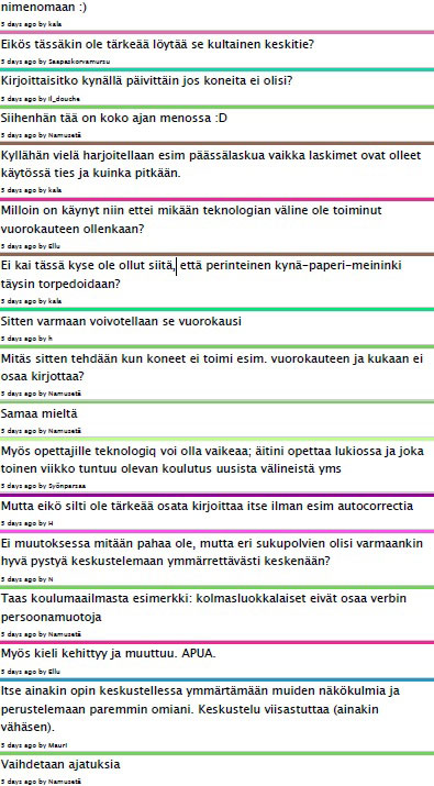 On myös selvää, että pelkät verkkosovellukset eivät tee luentotilanteesta keskustelevaa. Opettajan tehtäväksi jää edelleen tilanteen tekeminen dialogiseksi ja keskustelevaksi esimerkiksi suhtautumalla opiskelijoihin arvostaen ja tasavertaisesti, haastamalla opiskelijoiden lähtökohta-ajatuksia ja esittämällä keskusteluun kutsuvia kysymyksiä. Kokemukseni mukaan huoli siitä, että keskustelu verkkosovelluksissa tappaisi verbaalisen keskustelun luentosalissa, on turha.