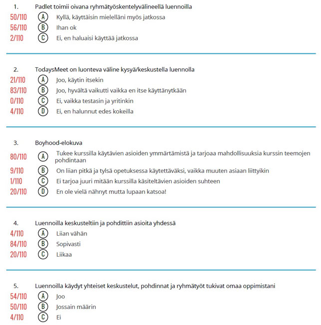 Loppuyhteenvetona totean, että omat kokemukseni verkkosovellusten käyttämisestä opiskelijoiden osallistajina luento-opetuksessa ovat järjestämäni luentosarjan perusteella positiivisia. Opiskelijapalautteen mukaan ne toimivat myös oppimisen tukena, mikä on tärkeää. Lisää erilaisia kokeiluja kuitenkin tarvitaan, jotta voitaisiin paremmin arvioida sitä, kuinka vastaava sovellusten käyttö on sovitettavissa muiden oppiaineiden ja opintojaksojen luentokäytäntöihin. Tärkeää olisi myös saada opettajien omat hyvät käytännöt jakoon, jotta kaikkien ei tarvitsisi keksiä pyörää uudestaan. Jo nyt löytyy epäilemättä lukuisia opettajia, jotka käyttävät verkkosovelluksia luento-opetuksessa jokseenkin samoin mutta usein toisistaan tietämättä.