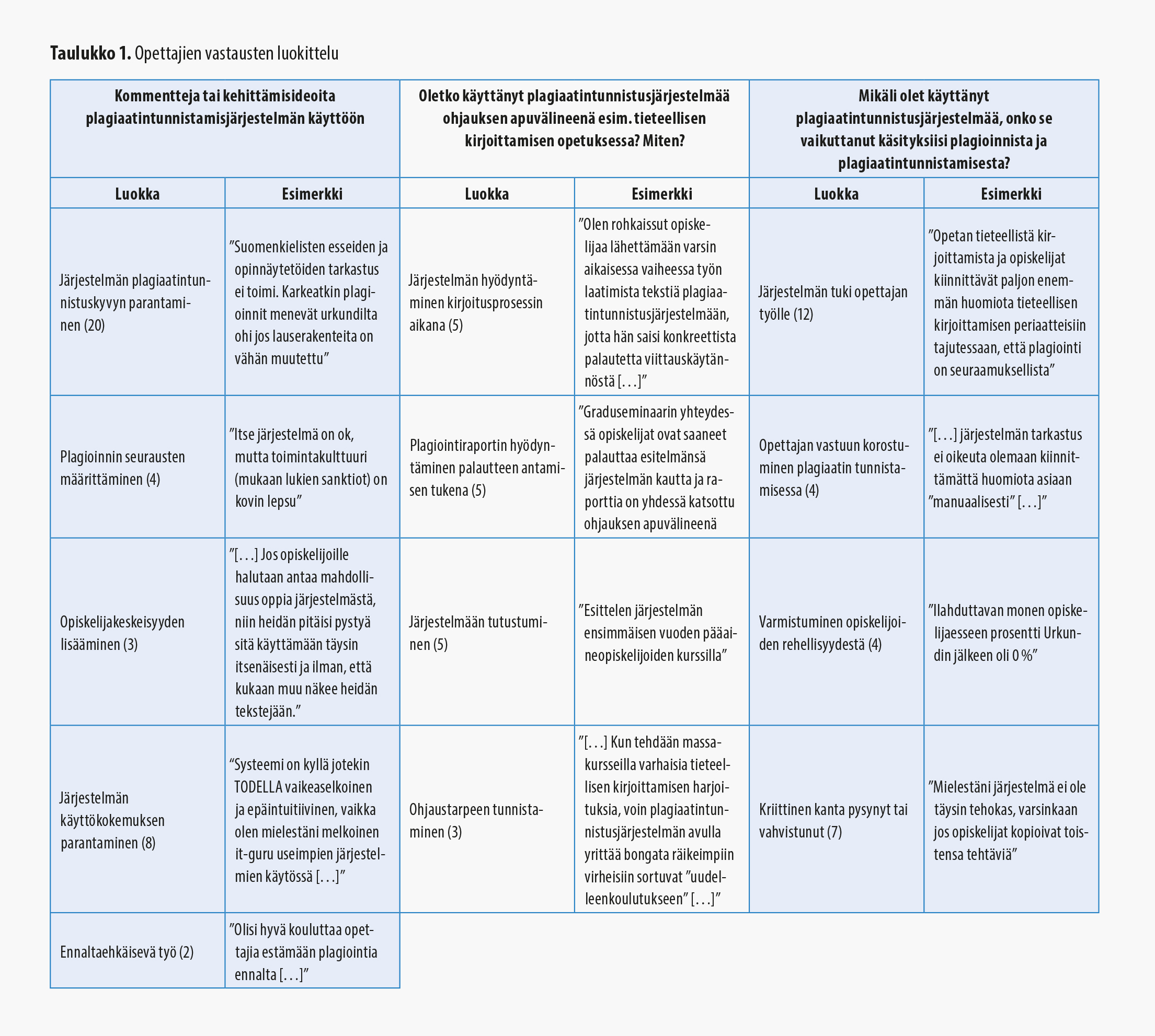 Opiskelijat pitivät plagiointia erittäin harvinaisena, mutta opettajien näkemysten mukaan plagiointia esiintyy jonkin verran. Tutkimustulosten mukaan plagiaatintunnistusjärjestelmää on käytetty pääasiassa plagioinnin tunnistamiseksi opiskelijoiden valmiissa töissä, eikä sitä ole kovin paljon hyödynnetty ohjauksessa. Opettajat kokivat järjestelmän käytön tukevan heidän työtään, mutta korostivat samalla vastuutaan plagioinnin tunnistamisessa. Järjestelmän käytön myötä opiskelijat ovat alkaneet kiinnittää enemmän huomiota omaan kirjoittamiseen, mutta esille nousivat myös kielteiset tunteet kuten pelot plagiointiin syyllistymisestä vahingossa. Lisäksi opiskelijat esittivät toiveen hyödyntää järjestelmää kirjoitusprosessin tukena. Järjestelmän hyödyntäminen ohjaustarkoituksessa nostaa esille opettajien kouluttamisen tärkeyden. Yliopistopedagogiikan koulutus voisi nykyistä enemmän tarjota yliopiston opettajille tukea tieteellisen kirjoittamisen ohjaamisessa.