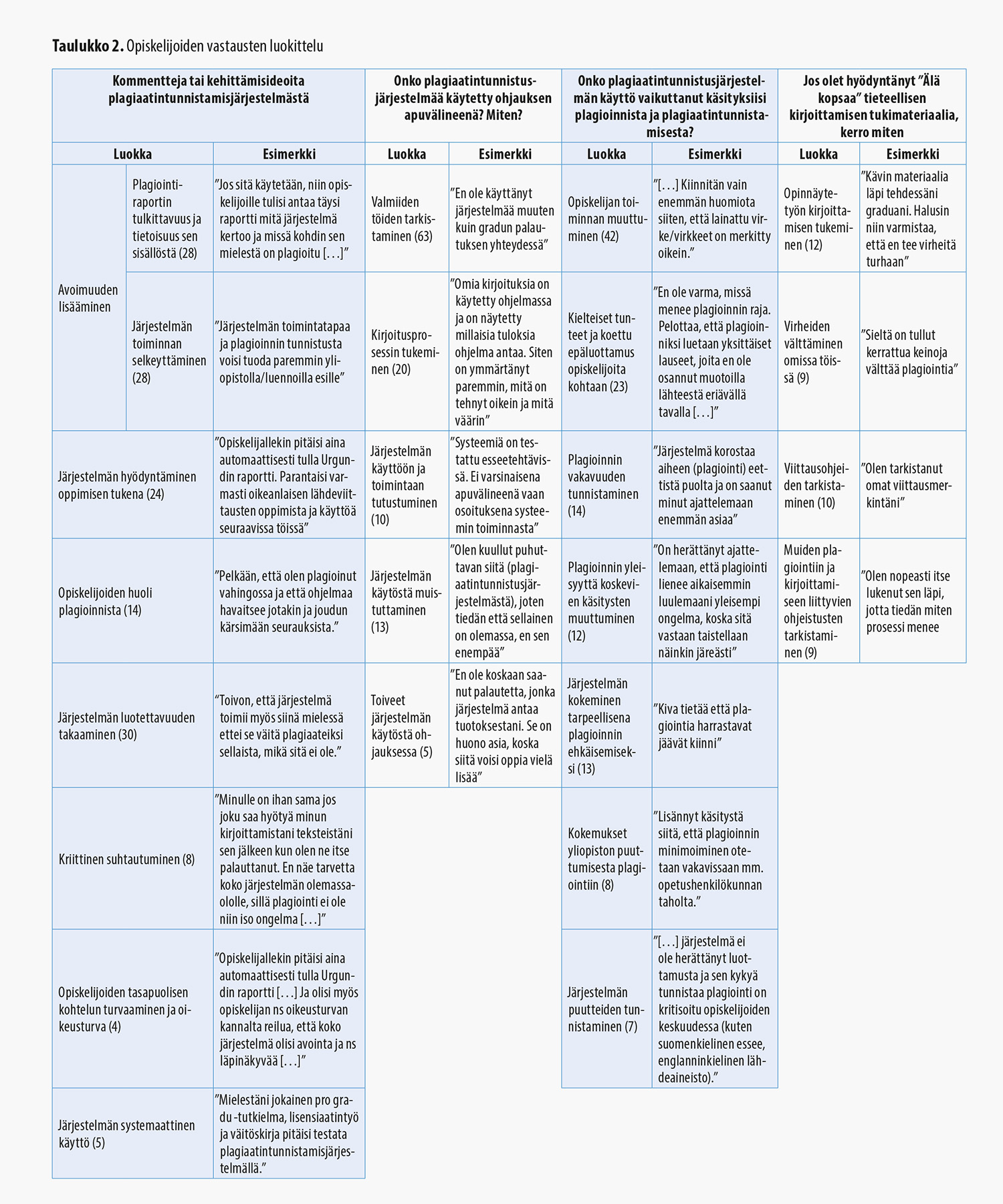 Opiskelijoiden vastauksista tunnistettiin seitsemän luokkaa, jotka kuvaavat järjestelmän käytön myötä muuttuneita käsityksiä plagioinnista ja opiskelusta: Opiskelijan toiminnan muuttuminen, Kielteiset tunteet ja koettu epäluottamus opiskelijoita kohtaan, Plagioinnin vakavuuden tunnistaminen, Plagioinnin yleisyyttä koskevien käsitysten muuttuminen, Järjestelmän kokeminen tarpeellisena plagioinnin ehkäisemiseksi, Kokemukset yliopiston puuttumisesta plagiointiin ja Järjestelmän puutteiden tunnistaminen.