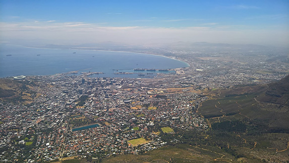 Pöytävuorelta avautui upea maisema Kapkaupungin yli, mikäli “pöytäliina” (pilviverho) ei peittänyt näkymää. (Kuva: Matti Lappalainen)