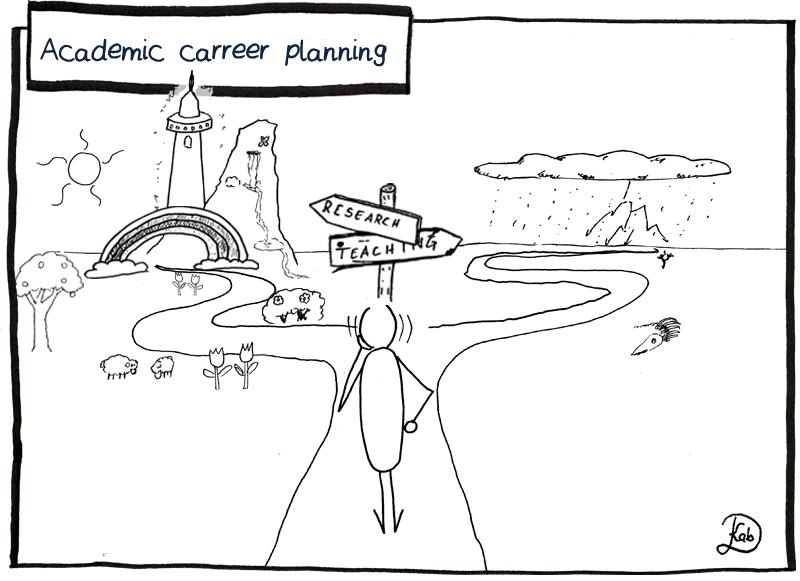 Kuva 1. Konferenssin osallistuja Daniel Al-Kabbani (Creaversity) kiteytti kuvallaan puheenvuoron tutkimuksen ja opettamisen rooleista akateemisessa urasuunnittelussa.