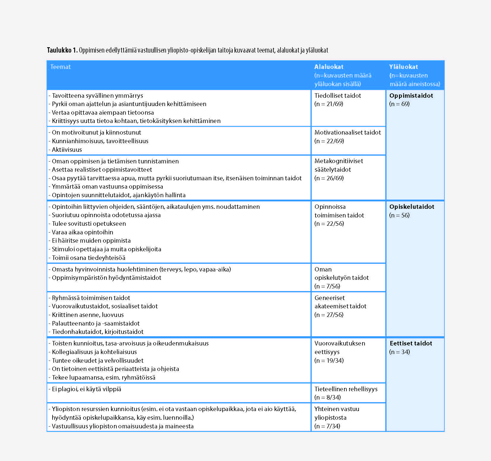 Tuotetun luokittelun mukaan oppimisen edellyttämät vastuullisen yliopisto-opiskelijan taidot voitiin jakaa oppimistaitoihin, opiskelutaitoihin ja eettisiin taitoihin (ks. taulukko 1, lähteiden jälkeen). Näistä kokonaisuutena painottuivat määrällisesti oppimistaitoihin liittyvät seikat, jonka sisällä eniten mainintoja saivat metakognitiiviset säätelytaidot. Opiskelutaidoissa vastaajat keskittyivät erityisesti yleisten taitojen rooliin. Eettisistä taidoista nostettiin esiin erityisesti eettisyyteen liittyvät vuorovaikutustaidot. Määrällisesti vähiten vastaajat kiinnittivät huomiota opiskelijan eettiseen yhteiseen vastuuseen yliopistosta, omasta hyvinvoinnista huolehtimiseen oppimistaitona sekä tieteelliseen rehellisyyteen.
