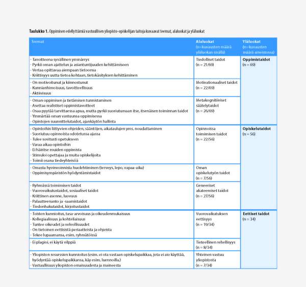 Taulukko 1. Oppimisen edellyttämiä vastuullisen yliopisto-opiskelijan taitoja kuvaavat teemat, alaluokat ja yläluokat (taulukon saa suuremmaksi sitä klikkaamalla)