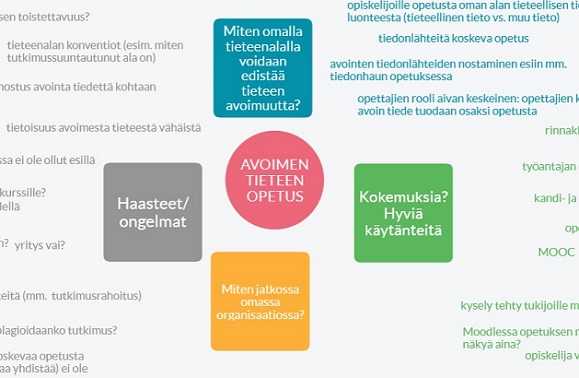Moni työpajaan osallistunut oli tullut kuulemaan, millaisia kokemuksia ja hyviä käytänteitä muilla oli aiheesta. Omia kokemuksia avoimen tieteen opettamisesta ei välttämättä vielä ollut. Toisaalta myös korostettiin, että esimerkiksi yliopistojen hallinnossa on tiedotettu avoimesta tieteestä hyvin ja aihe on ollut paljon esillä. Myös yliopistokirjastot ovat järjestäneet paljon erilaisia tapahtumia, ja infoja avoimesta tieteestä, joihin kaikki yliopistolaiset ovat olleet tervetulleita. Työpajassa toivottiin, että tarjolla olisi myös ajasta ja paikasta riippumattomia infoja.