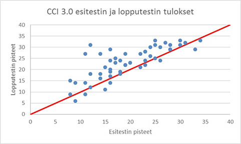 Kuva 1. CCI-testin esi- ja lopputestin tuloksien vertailu. Yksittäinen piste kuvaa tietyn opiskelijan tuloksia. Yhtenäinen suora osoittaa kohtaa, jossa esi- ja lopputestin tulokset ovat samat, suoran yläpuolella olevissa pisteissä lopputestin tulos on parempi kuin esitestissä