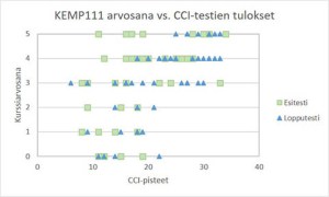 CCI-testin tuloksia verrattiin myös KEMP111-kurssin arvosanaan (kuva 2). Lopputestin tulokset näyttävät korreloivan kurssiarvosanan kanssa voimakkaammin kuin esitestin tulokset. Suoraa korrelaatiota ei esitestin ja kurssiarvosanan välillä havaita, mikä havainnollistaa sitä, ettei heikompikaan kemian osaamistausta estä kurssilla menestymistä. Toisaalta myös heikolla lopputestituloksella on saatu hyviä arvosanoja kurssista, mikä osoittaa, että kurssin loppukoe ja CCI-testi eivät mittaa täysin samanlaista kemian osaamista. Kurssiarviointi perustuukin tällä hetkellä enemmän perinteisiin kemian tehtäviin (laskut ja rakennemääritykset), kun taas CCI mittaa selvemmin kemian käsitteiden ymmärtämistä.