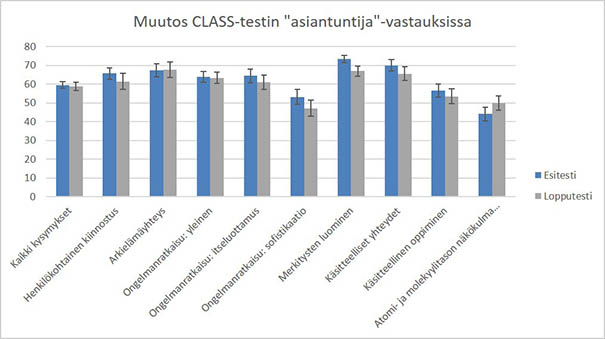 CLASS-asennetestin analyysissä opiskelijoiden vastauksia verrattiin kemian asiantuntijoiden samassa testissä antamiin vastauksiin eri kategorioissa, eli kuinka suuri osa opiskelijoista vastasi samoin kuin asiantuntijat (kuva 3) (Adams ym., 2008). Tulokset olivat jo esitestissä melko positiivisia: opiskelijat vastaavat usein kysymyksiin keskimäärin samalla tavalla kuin kemian asiantuntijat (kuva 3). Asiantuntijamaisten vastausten osuudet ovat samaa luokkaa tai suurempia kuin aikaisemmin julkaistuissa kemian CLASS-testeissä (Adams ym., 2008; Schaller ym., 2015).