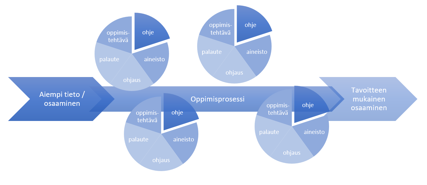 Verkkokurssin rakenteen suunnittelun tukena voidaan hyödyntää MOOC (massive open online course) –malleja. Nämä kurssit kestävät tyypillisesti 10 viikkoa, ja opetus rakentuu videoiden, harjoitustehtävien ja artikkelien varaan (Timonen & Toivanen, 2015). Kurssin pohjaksi tulee laatia oppimisprosessin sekä sen ohjauksen kuvaus. Lineaarisen lisäksi prosessi voi olla osaamistason mukaan haarautuva ja palaava, verkkomainen kuten hypertekstirakenteet tai opiskelijaorientoitunut (Simonson, Smaldino, & Zvacek, 2015). Oppimisprosessiin tässä esimerkissä sisältyy useita oppimistilanteita (kuvattu kuviossa 1 ympyröinä), joihin liittyy tietty teema, oppimistavoitteet, oppimistehtävät, tietolähteet tai materiaali sekä ohjaus ja arviointi.