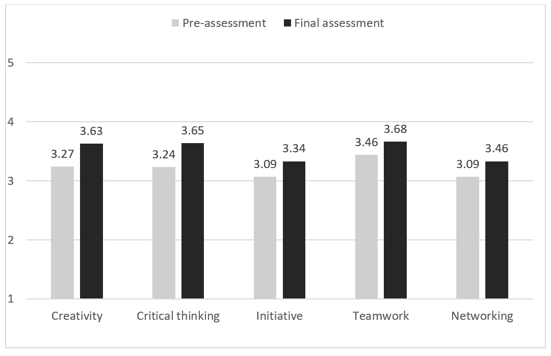 Furthermore, the consistent results of interviews gave evidence and support also for the results of quantitative self-assessments. As demonstrated in Figure 1, according to the pre- and final self-assessments based on the results of paired samples t-test, students developed all five innovation competences during the specific courses, creativity: t (63) = -5.91; p<0.001, critical thinking: t (61) = -5.95; p<0.001, initiative: t (62) = -3.94; p<0.001, teamwork: t (61) = -3.42; p=0.001 and networking: t (51) = -4.58; p<0.001. There are statistically significant differences between means of pre- and final assessments in all five dimensions of innovation competences.