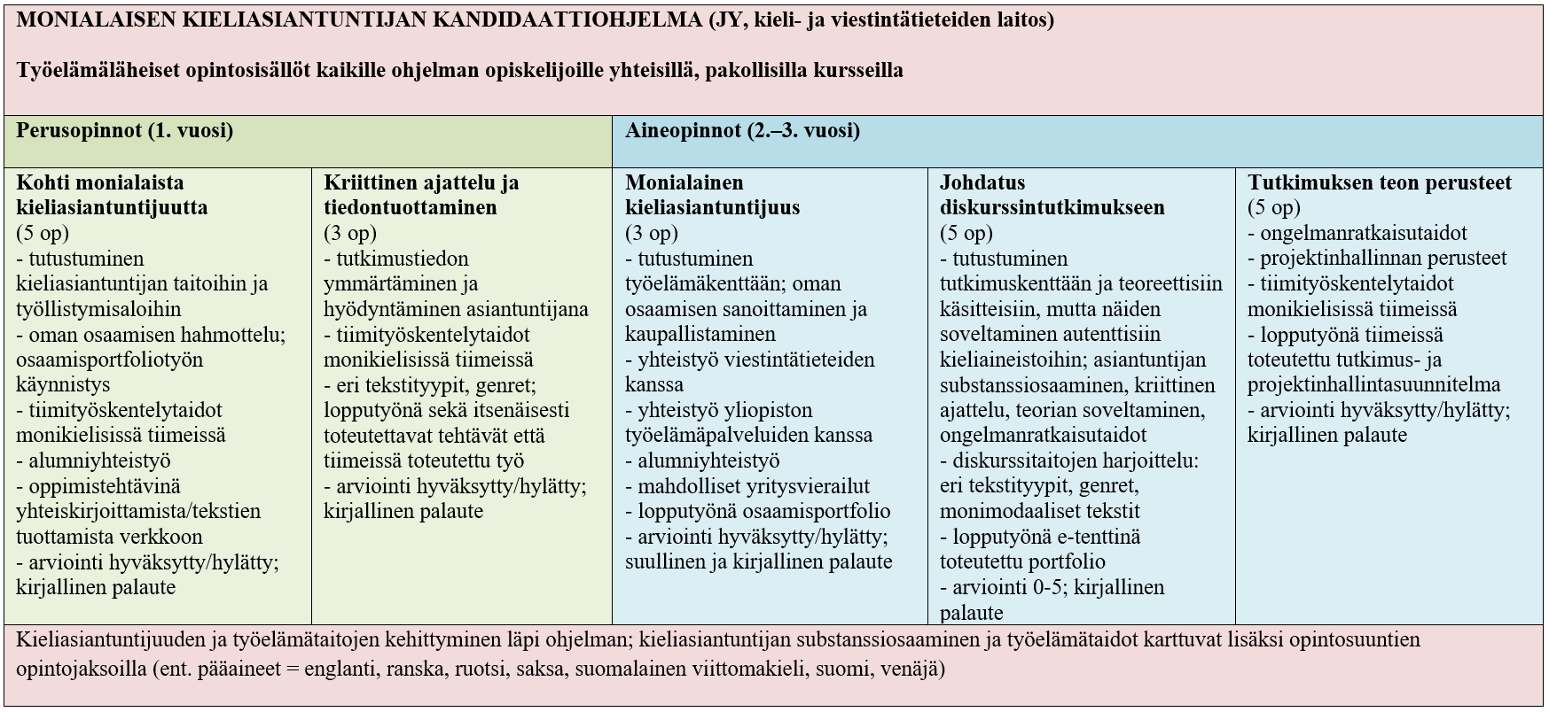 Hankkeen lopputulemana työelämäläheisyyttä on saatu nivottua kaikille kandidaattiohjelman yhteisille pakollisille kursseille. Perusopintojen kurssia Kohti monialaista kieliasiantuntijuutta on laajennettu ja kurssivalikoimaan on lisätty uusi perusopintojen kurssi Kriittinen ajattelu ja tiedontuotanto sekä uusi aineopintojen kurssi Monialainen kieliasiantuntijuus. Lisäksi työelämäläheisyyttä ja portfolio-opintoja tukevia sisältöjä on huomioitu kahdella muulla aineopintojen kurssilla Johdatusta diskurssintutkimukseen ja Tutkimuksen teon perusteet (ks. taulukko 1). Opiskelijoiden näkökulmasta hajanaiselta näyttäytynyt osaamisportfoliotyöskentely on jämäköitetty nivomalla se osaksi perus- ja aineopintojen opintojaksoja, joille sisältyy lähiopetusta, ryhmätyöskentelyä, itsenäistä työskentelyä ja palautekeskusteluja. Tärkeäksi huomattiin myös alumniyhteistyön merkitys ja sen kehittäminen ja alumneja hyödynnetään jatkossa paitsi etenkin yhteisten perus- ja aineopintojen kurssien vieraina, myös kurssisisältöjen kommentoijina ja valmistumisvaiheessa olevien opiskelijoiden mentoreina.