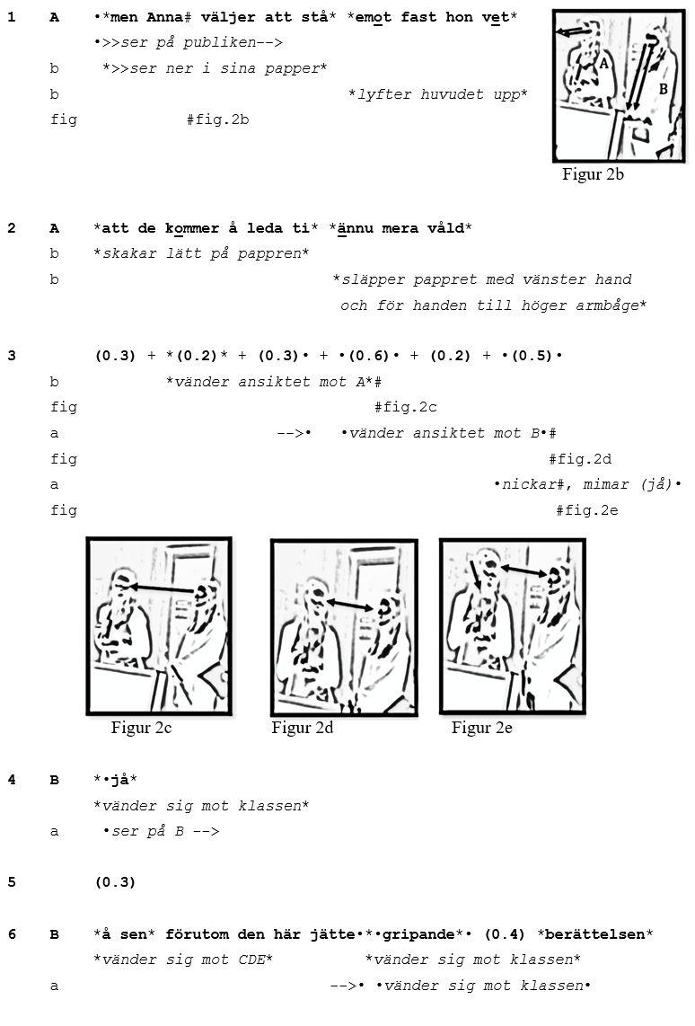 Under A:s sista mening (rad 1–2) lyfter B på huvudet och ser på klassen, och 0,3 sekunder efter det sista ordet, våld, vänder B sin blick mot A (rad 3, figur 2c). Strax därefter vänder sig A mot B och deras blickar möts (rad 3, figur 2d). A nickar (rad 3, figur 2e) och mimar jå, och direkt därefter säger B jå, samtidigt som hon vänder sig mot klassen (rad 4). Därefter inleder hon sin egen tur (rad 6), medan hon först vänder sig mot CDE och sedan tillbaka mot klassen. A, som gett över turen till B, fortsätter att se på B fram till jättegripande, då hon vänder sig mot klassen och riktar blicken framåt och en aning neråt.