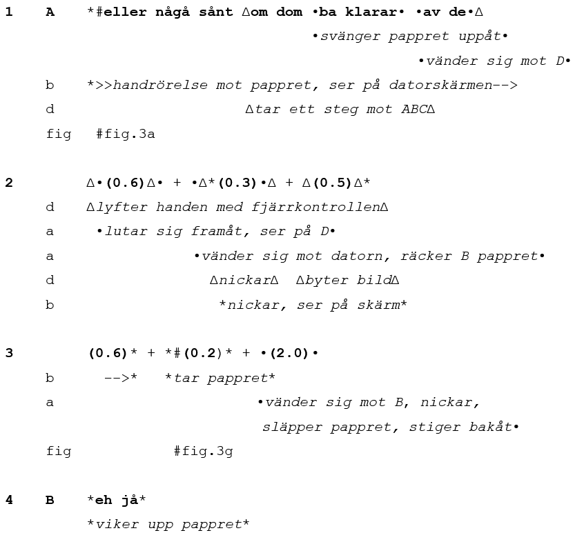 Under slutet av A:s tur pillar följande talare, B, på sina fingrar och tittar ner på dem, men då A börjar närma sig slutet på sin tur, redan några ord innan han säger eller någå sånt om dom ba klarar av de, vänder sig B snett mot A och börjar närma sig pappret som A håller i handen. Stillbildsserien nedan, figur 3b–g, får illustrera hur detta gemensamma manus fungerar som en resurs vid turbytet. Den talare som står till vänster och håller i det gemensamma manuset (A) håller alltså på att avrunda sin tur, och B som står till höger står i tur att ta över.