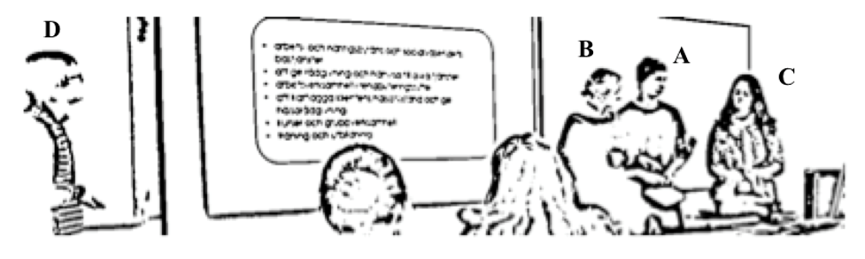 Figur 2a. Stillbild av hela gruppen då talare A håller på att avrunda sin tur.