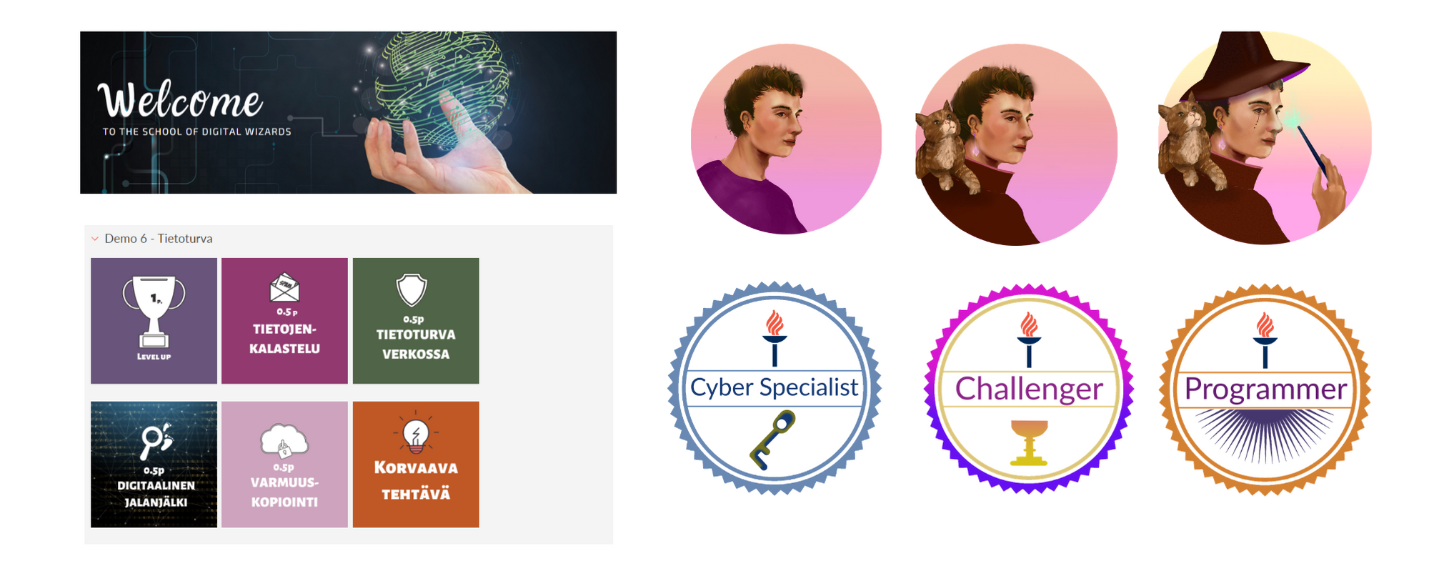 - Pelillistetylle osuudelle esitettiin kehystarina “digivelhokoulusta”. Tämä teema näkyi myös Moodle-kurssin ulkoasussa. Tarkoituksena oli erityisesti edistää pelilliseen ympäristöön uppoutumista.
