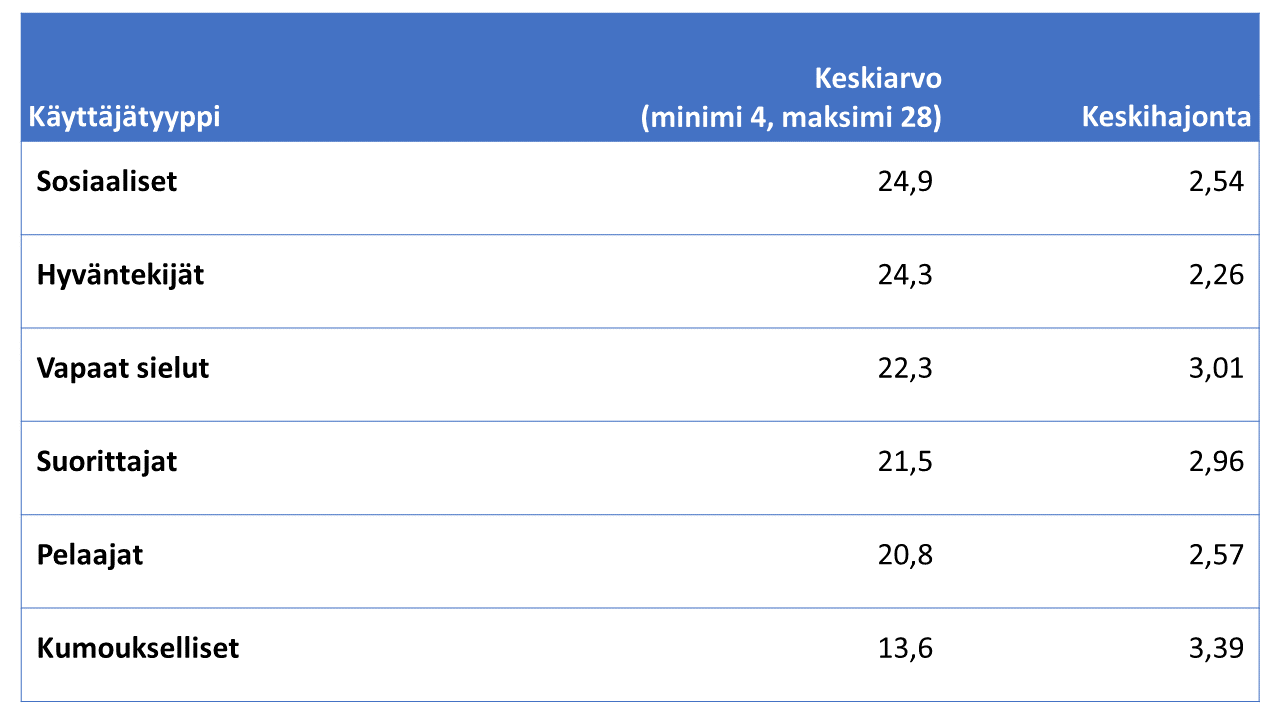 Kaikista käyttäjätyypeistä sosiaalisten (keskiarvo 24,9) ja hyväntekijöiden (24,3) yhteispisteet erottuivat selvästi muita korkeampina tässä osallistujaryhmässä (ks. taulukko 1). Ylivoimaisesti matalin keskiarvo (13,6) puolestaan oli kumouksellisilla.