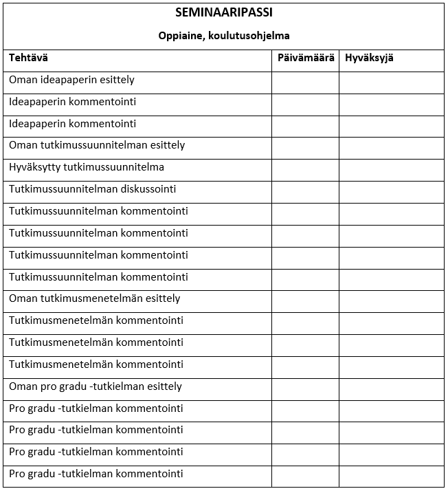 Seminaaripassia käytetään tutkielmaseminaarissa, jonka opiskelija voi aloittaa syys- tai kevätlukukauden alussa. Seminaaripassi on käytännössä A4-kokoinen sivu, johon opiskelijat keräävät suoritusmerkintöjä suoritettuaan vaaditut osatehtävät (liite 1). Tehtävät voi suorittaa useamman lukukauden aikana, mutta tarpeen tullen jo yhdessä lukukaudessa. Seminaari katsotaan suoritetuksi, kun passin tehtävät on tehty.