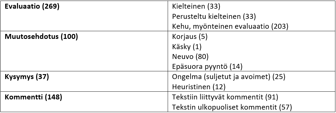 Aineiston luokittelussa käytimme apuna ATLAS.ti 7.0 analyysiohjelmaa. Analyysin teimme teorialähtöisen sisällönanalyysin mukaisesti ja hyödynsimme aineiston luokittelussa myös kvantifiointia (ks. Tuomi & Sarajärvi, 2018). Käytimme analyysin apuna Svinhufvudin (2016) tekemää jäsennystä, joka pohjautuu Straubin ja Lunsfordin (1995) kuvaukseen. Siinä palaute jaetaan neljään eri muotoon: 1) evaluaatioihin eli arvioihin, 2) muutosehdotuksiin, 3) kysymyksiin, joissa kiinnitetään huomiota tiettyyn tekstikohtaan eikä suoraan ehdoteta muutoksia, 4) kommentteihin, jotka esimerkiksi kuvailevat tekstiä tai tuovat esille lukijan tulkintoja siitä (Straub & Lunsford, 1995; Svinhufvud, 2016).
