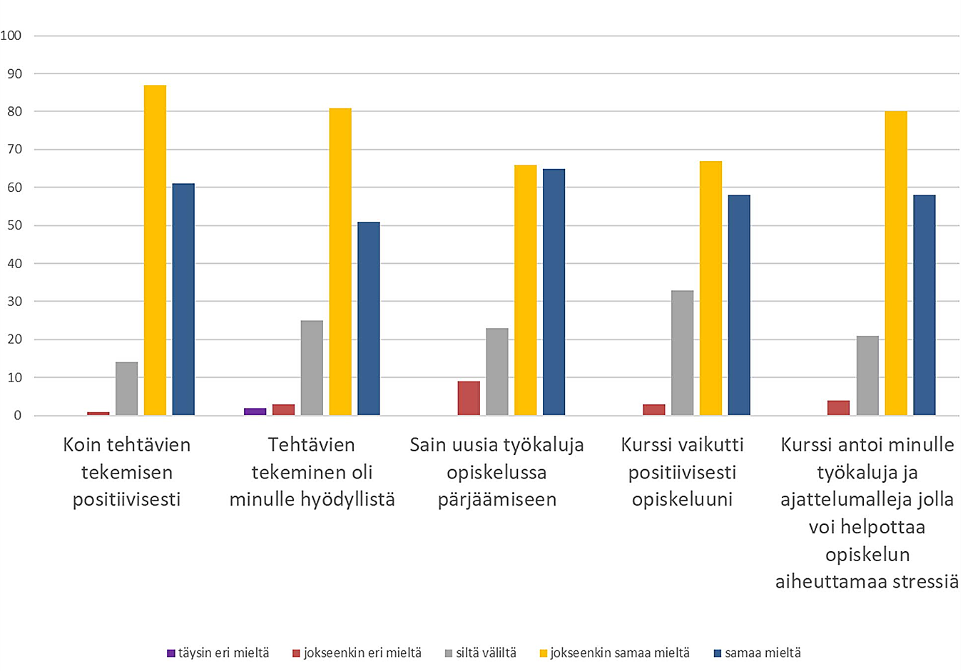 Kurssin loppumittauksessa opiskelijat vastasivat Likert-asteikollisiin kysymyksiin koskien heidän kokemuksiaan kurssista. Opiskelijoista 91 prosenttia oli jokseenkin tai täysin samaa mieltä siitä, että kurssin tehtävien tekeminen oli positiivinen kokemus ja 81 prosenttia opiskelijoista oli jokseenkin tai täysin samaa mieltä siitä, että tehtävät olivat hyödyllisiä. Yhteensä 80 prosenttia opiskelijoista oli jokseenkin tai täysin samaa mieltä siitä, että he saivat uusia keinoja opiskelussa pärjäämiseen ja 77 prosenttia oli jokseenkin tai täysin samaa mieltä siitä, että kurssi vaikutti positiivisesti opiskeluun. Viimeiseen kysymykseen: ”Kurssin tavoitteena oli antaa sinulle työkaluja ja erilaisia ajattelumalleja, joilla voit helpottaa opiskelun aiheuttamaa kuormittavuutta tai stressiä. Tämä tavoite toteutui kurssilla” 85 prosenttia opiskelijoista oli vastannut olevansa jokseenkin tai täysin samaa mieltä. Opiskelijan kokemukset kurssista Likert-asteikoilla mitattuna näkyvät kuviossa 1.