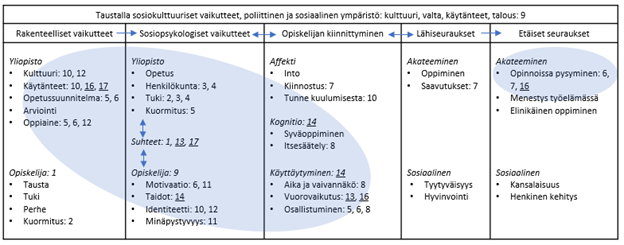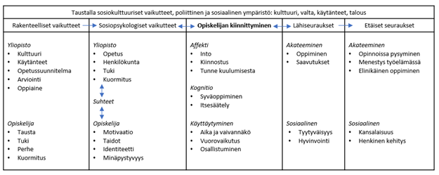 Mallin (Taulukko 1) keskiössä on opiskelijan kiinnittyminen, joka jakautuu affektiiviseen, kognitiiviseen ja behavioristiseen osaan, kiinnittymistutkimuksen psykologisen haaran mukaisesti. Se on vuorovaikutuksessa sosiopsykologisiin vaikutteisiin, joita syntyy yliopistossa esimerkiksi opetuksesta ja kuormituksesta suhteessa opiskelijan sisäisiin vaikutteisiin kuten motivaatioon ja taitoihin. Opiskelijan kiinnittyminen on lisäksi vuorovaikutuksessa sen lähiseurauksiin, jotka Kahu (2013, 767) jakaa akateemisiin (esim. opiskelusaavutukset) ja sosiaalisiin (esim. tyytyväisyys), viitaten Tinton (1975) opiskelijan integroitumisen malliin.