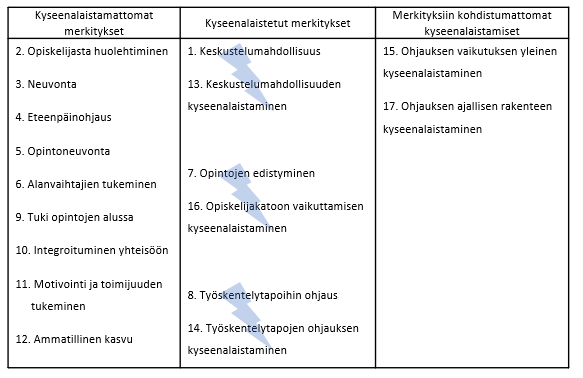 Omaopettajaohjauksen merkitykset ja kyseenalaistamiset keskittyivät rakenteellisiin vaikutteisiin, sosiopsykologisiin vaikutteisiin ja opiskelijan kiinnittymiseen (Taulukko 3). Painotus rakenteellisissa vaikutteissa oli erityisesti yliopistolla, opiskelijan kiinnittymisessä puolestaan osiolla käyttäytyminen. Lähiseurauksiin, etäisiin seurauksiin ja taustan sosiokulttuurisiin vaikutteisiin viittasivat harvat luokat, pois lukien etäisten seurausten opinnoissa pysymisen, johon viittasi kolme luokkaa. Kyseenalaistamisista Ohjauksen vaikutuksen yleinen kyseenalaistaminen puuttuu Taulukosta 3, sillä se ei ollut liitettävissä kiinnittymisen yksittäisiin osa-alueisiin.