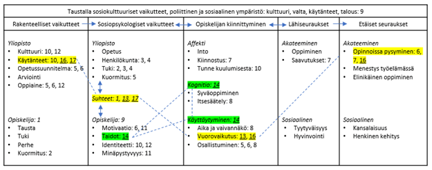 Työskentelytapojen ohjaamisen kyseenalaistaminen puolestaan yhdistää opiskelijan taitojen, kognition ja käyttäytymisen (Taulukko 4). Nämä sosiopsykologisiin vaikutteisiin ja opiskelijan kiinnittymiseen liittyvät elementit ovat vastavuoroisessa suhteessa toisiinsa. Käyttäytymisen alle kuuluva vuorovaikutus sekä sosiopsykologisiin vaikutteisiin kuuluva suhde opiskelijan ja yliopiston välillä yhdistävät nämä kaksi kyseenalaistamisten ketjua toisiinsa.