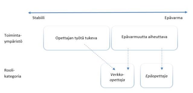 Uusien digitaalisten teknologioiden edellyttämät taidot, kehityksen nopea tahti, opetustilanteiden hallinnan siirtyminen opettajalta teknologialle sekä tukitoimien vähäisyys lisäsivät siis ympäristön aiheuttamaa epävarmuutta. Yhdessä nämä moninaiset tekijät muodostivat opettajille kokemuksen epävarmuutta tuottavasta toimintaympäristöstä.