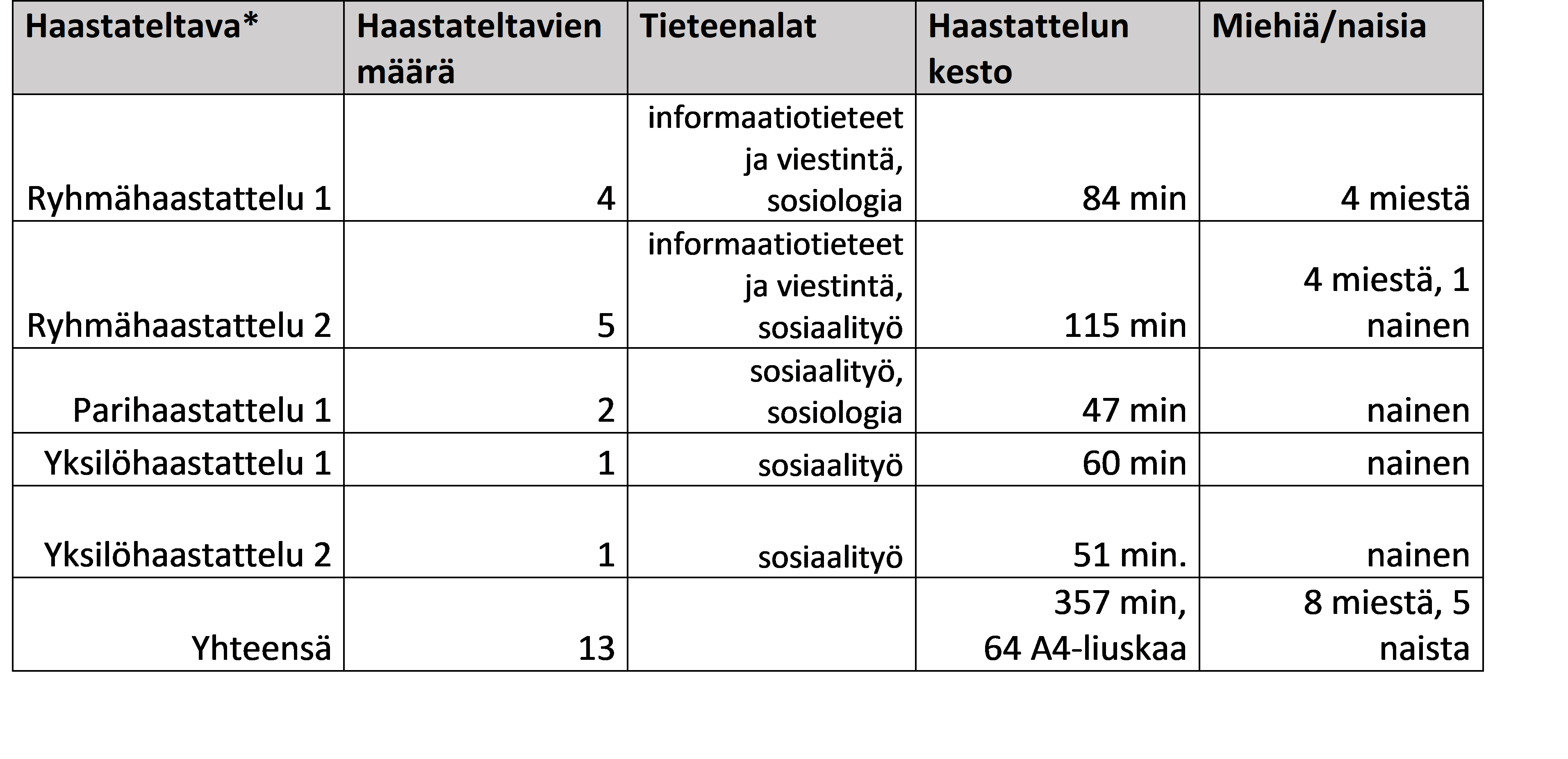 Haastattelututkimuksen kohderyhmänä olivat erään suomalaisen yliopiston opettajat, jotka käyttävät työssään erilaisia digitaalisia opetusteknologioita. Opettajat edustivat kolmea eri tieteenalaa: informaatiotieteitä ja viestintää, sosiologiaa sekä sosiaalityötä. Haastattelut suoritettiin yksilö-, pari- ja ryhmähaastatteluina, joihin valikoitui yhteensä 13 digitaalisen opetusteknologian käyttökokemusta omaavaa opettajaa. Yksi haastatteluista oli parihaastattelu, kaksi toteutettiin yksilöhaastatteluina ja kaksi ryhmähaastatteluina. Yksilö- ja parihaastatteluissa korostuivat opettajan oman toiminnan ja ajatusten itsereflektio. Ryhmähaastattelujen (Liitteessä 1) avulla tavoiteltiin opettajien välisten kokemusten, tunteiden ja ajatusten vaihtoa (ks. Mäntyranta & Kaila, 2008). Sekä tutkimuksen kohteena oleva yliopisto että haastattelusitaatit on anonymisoitu.