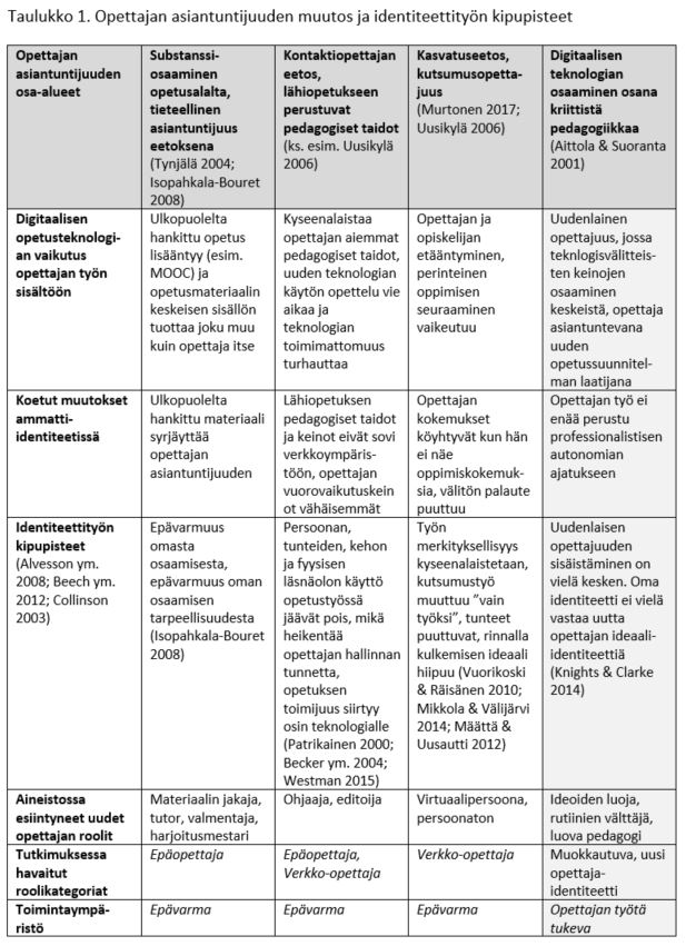 Ensimmäisenä esille nouseva opettajan asiantuntemuksen perinteinen osa-alue, substanssiosaaminen (Isopahkala-Bouret, 2008; Tynjälä, 2004), joka on menettänyt merkitystään digitaalisten opetusteknologioiden käyttöönoton myötä, kun muualla tuotettuja opetusmateriaaleja tulee lisää. Opettajat joutuvat pohtimaan opettajan työn olemusta ja sen ydinosaamista sekä sitä, mihin omaa osaamista oikein tarvitaan. Nämä pohdinnat heijastavat perinteisen ammatti-identiteetin murtumista. Opettajan keskeisenä roolina ei olekaan enää substanssiosaamisen jakaminen tai oman opetusmateriaalin valmistelu, vaan opettajan roolia voi kuvailla ennemmin materiaalin jakajaksi, tutoriksi, valmentajaksi tai harjoitusmestariksi. Moni opettaja kokee tällaiset roolit ja niihin liittyvät tehtävät omalle ammatti-identiteetilleen vieraiksi ja henkilökohtaisella tasolla ristiriitaisiksi (ks. Laiho, Jauhiainen & Jauhiainen, 2017). Identiteettityön kipupisteeksi muodostuu näin epävarmuus omasta osaamisesta ja sen tarpeellisuudesta (Isopahkala-Bouret, 2008).