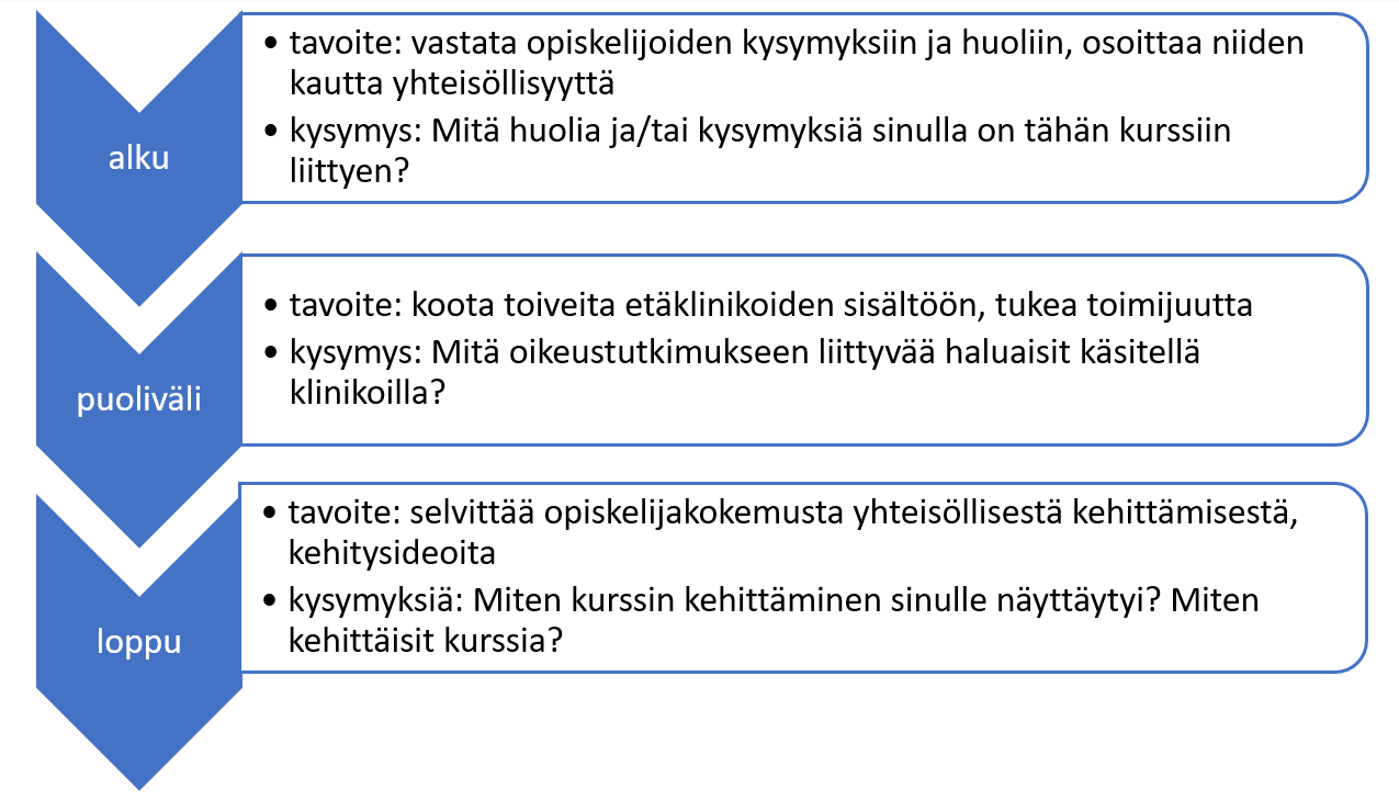 Kurssin alussa, ensimmäisen luennon ja opetuskokonaisuuden avautumisen jälkeen kartoitettiin, millaisia kurssiin liittyviä kysymyksiä ja huolia opiskelijoilla oli. Tavoitteena oli vastata opiskelijoiden kysymyksiin ja huoliin sekä osoittaa niiden olevan jaettuja. Puolivälissä kysyttiin ideoita ja ehdotuksia kolmeen etäklinikkaan, jotka perustuivat käänteiselle oppimiselle (ks. esim. Bergmann & Sams, 2015; Talbert & Bergmann, 2017). Tässä vaiheessa kurssin kuudesta teemakokonaisuudesta oli avattu neljä. Kyselyn tavoitteena oli selvittää, millaista sisältöä opiskelijat toivoivat klinikoille opiskeltujen kokonaisuuksien perusteella. Kaksi ensimmäistä kyselyä liittyivät siten kurssin kehittämiseen sen aikana.
