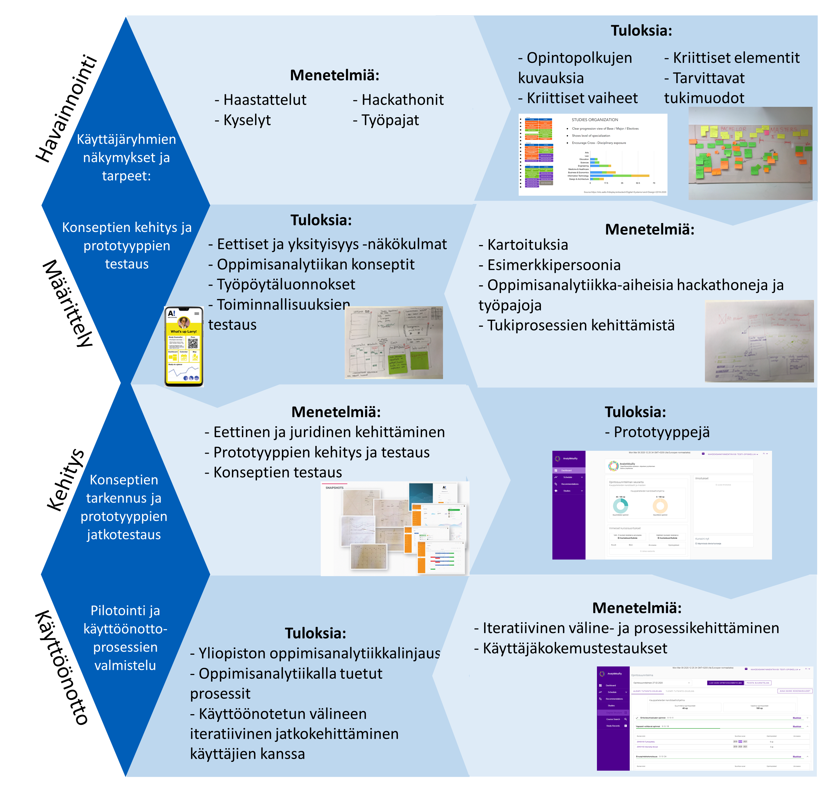 Oppimisanalytiikan näkökulmasta käyttäjäkeskeisyyden tulisi kattaa kaikki yliopiston toimijat. Käyttäjäkeskeisyys tarkoittaa yksittäisen oppimisanalytiikkaratkaisun kohdeprosessin ja sen toimijoiden näkökulmien varmistamista. Jotta analytiikkaratkaisut olisivat osuvia, olemme nojautuneet vahvasti käyttäjien osallisuuteen kehittämistyössä (Lallimo & Sjöblom, 2020; Silvola, Näykki, Kaveri & Muukkonen, 2021; Torkkeli & Lallimo, 2019). Myös AnalytiikkaÄly-hankkeessa hyödynnettiin käyttäjäkeskeistä lähestymistapaa oppimisanalytiikkatarpeiden ja -kyvykkyyksien selvittämiseksi. Ensimmäisessä vaiheessa selvitettiin sidosryhmien tarpeita ja näkemyksiä hyödyntämällä työpajoja, haastatteluja ja kyselyitä. Näissä työstettiin kokonaiskuvaa käyttäjätarpeista kulloinkin valitun teeman mukaisesti, esimerkiksi ihanteellisen opintopolun kriittisiä vaiheita sekä tärkeitä tuen elementtejä. Näiden perusteella kehitettiin valitun teeman konseptia yhteistyössä käyttäjäryhmien kanssa, esimerkiksi opintojen suunnitteluprosessin tukemista analytiikalla opintopolun sujuvoittamiseksi. Hankkeen käyttäjätarveselvityksiä ja kehittämistä on kuvattu kirjallisuudessa (ks. Hooli, 2020; Okkonen, Helle & Lindsten, 2020; Torkkeli & Lallimo, 2019; Vaara, 2020).