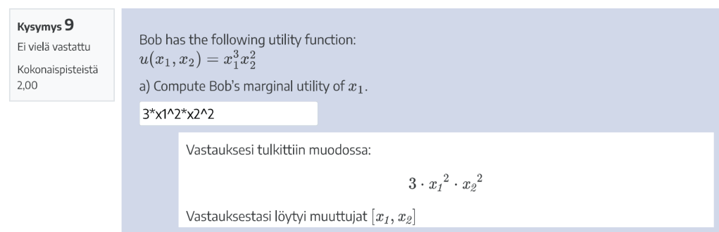 Kuva 1. Esimerkki Moodle STACK -kysymyksestä, opiskelijan vastauksesta ja automaattisesta vastauksen tulkinnasta