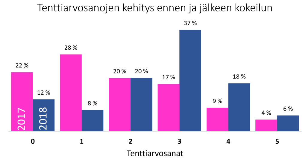 Yleisesti ottaen kokeilu näytti nostavan arvosanoja erityisesti jakauman alapäässä, mutta ylimmän arvosanan saaneiden määrä osuus säilyi käytännössä entisellään. Kuviossa 1 on vertailtu kokeilua edeltävän vuoden ja muutettujen harjoitusten aikana saatujen arvosanojen jakaumia.